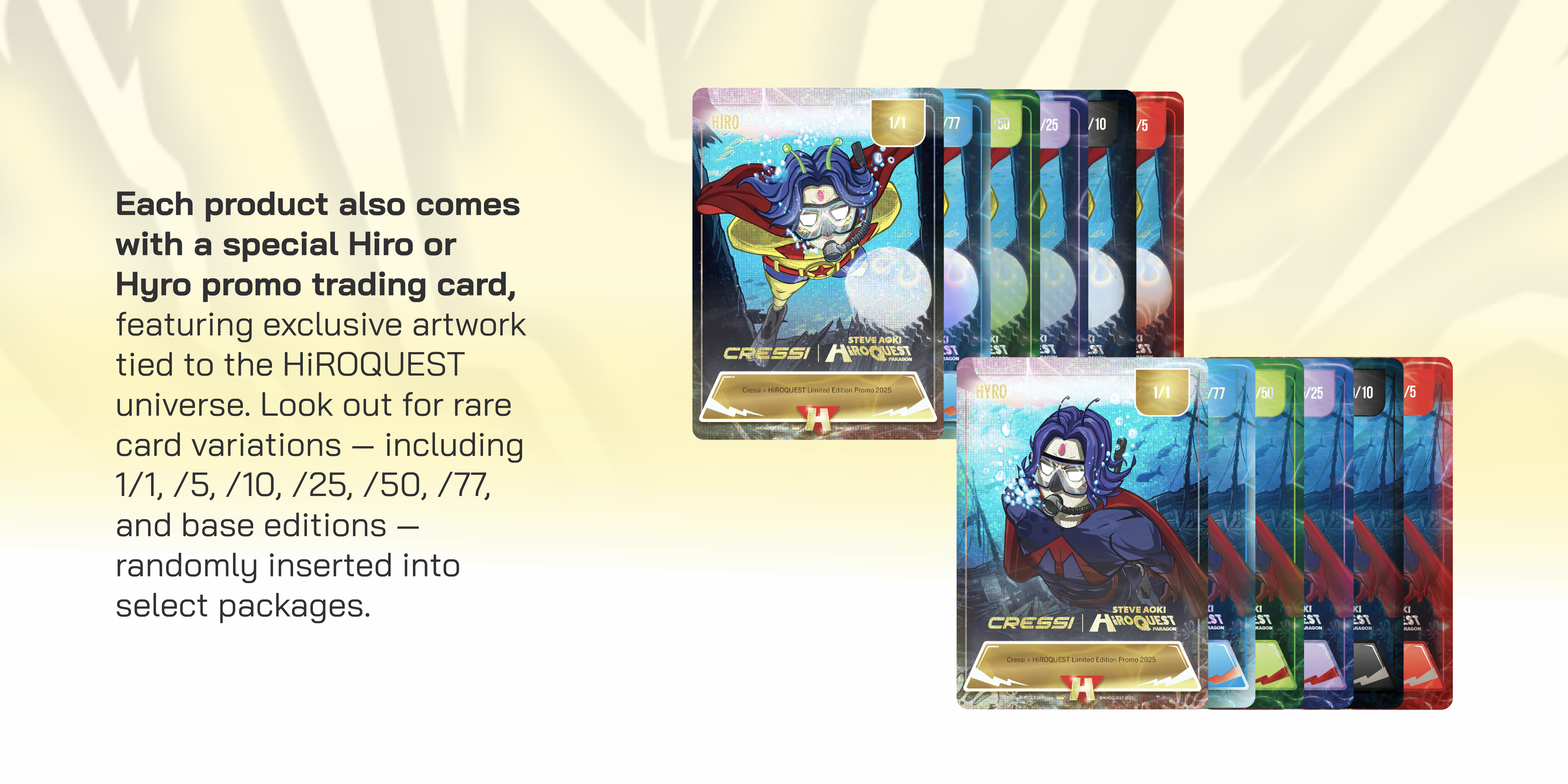 Cada produto também vem com uma carta promocional especial de Hiro ou Hyro, com arte exclusiva vinculada ao universo HiROQUEST. Fique de olho nas variações raras de cartas incluindo 1/1, /5, /10, /25, /50, /77 e edições básicas inseridas aleatoriamente em pacotes selecionados.