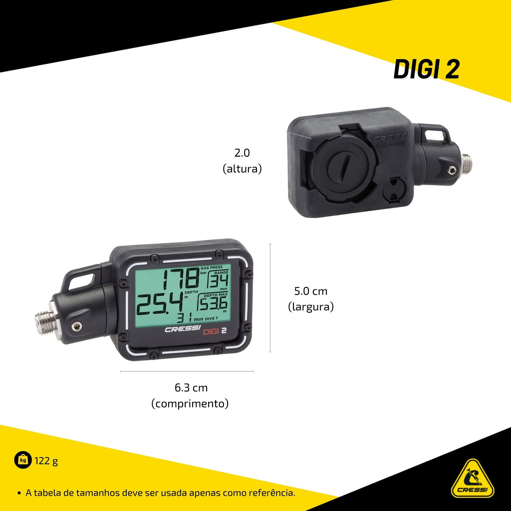 O Console Digital Cressi Digi 2 é um console digital compacto que combina design moderno e alta precisão para monitorar dados essenciais em mergulhos. Ele foi projetado para medir pressão do cilindro, profundidade e temperatura, com uma interface de fácil leitura que facilita a tomada de decisões subaquáticas.O Digi 2 é leve e eficiente, proporcionando segurança e conforto ao mergulhador.