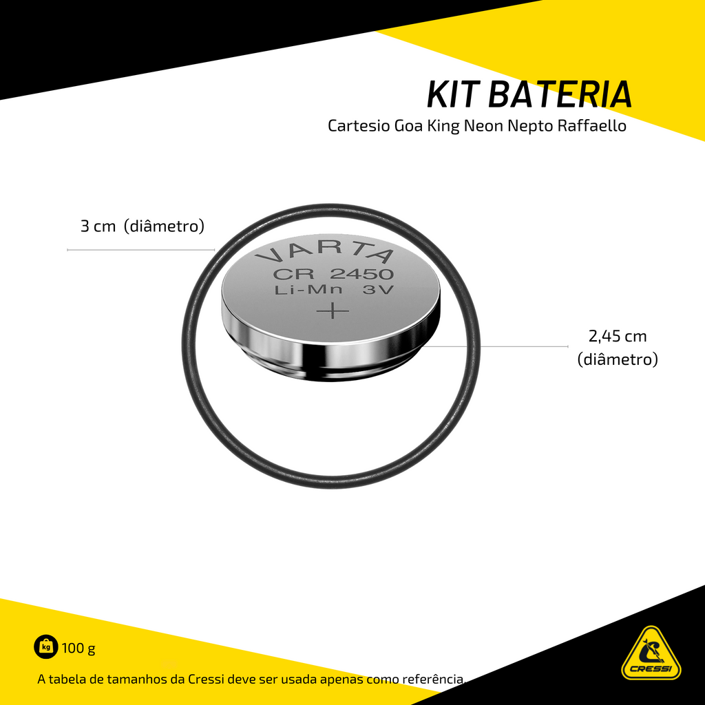 O Kit Bateria Cressi Cartesio Goa King Neon Nepto Raffaello Inclui os componentes necessários para garantir o perfeito funcionamento do seu computador de mergulho.