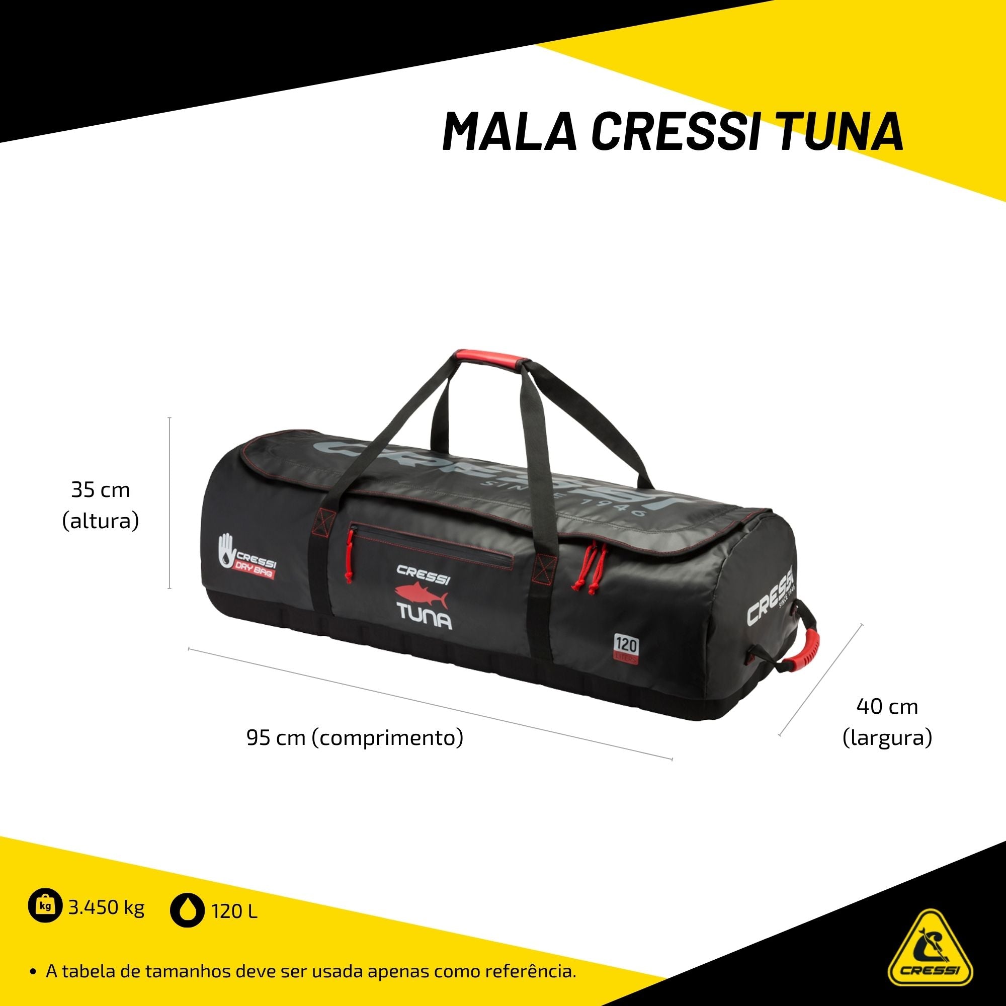 A Mala Cressi Tuna é ideal para mergulhadores que buscam uma solução prática e confiável para transporte de equipamentos.