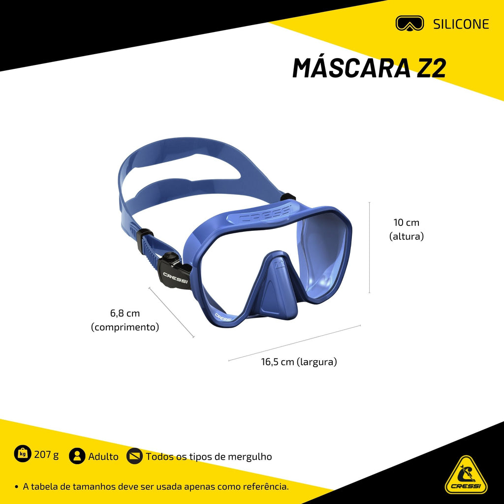 Com a Máscara de Mergulho Cressi Z2, você estará pronto para explorar o mundo subaquático com um campo de visão superior, segurança e muito conforto.