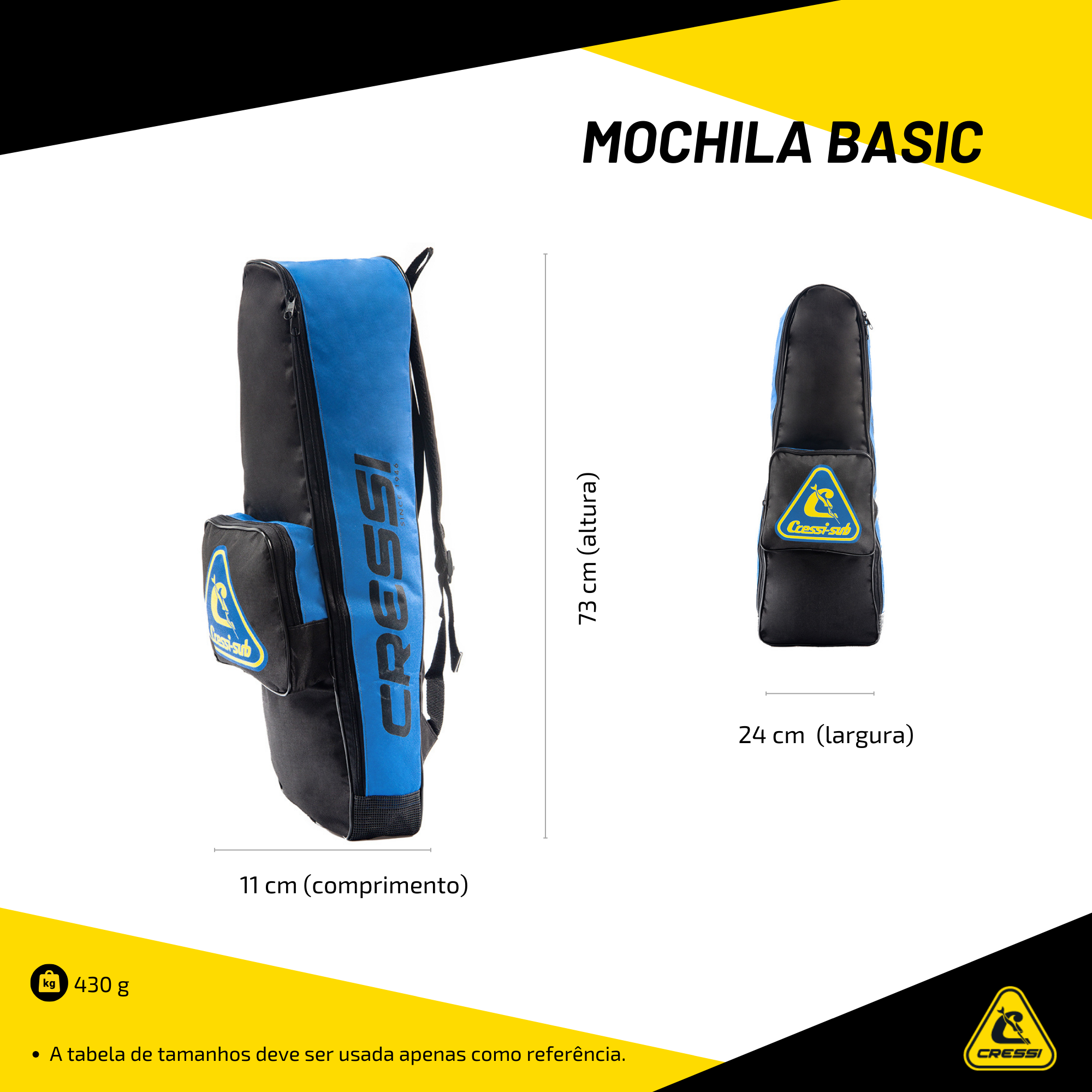 A Mochila Cressi Basic 3 foi projetada para oferecer praticidade e segurança no transporte do seu kit básico de mergulho. Produzida com materiais de alta qualidade, combina durabilidade e leveza, sendo ideal para mergulhadores iniciantes ou experientes.