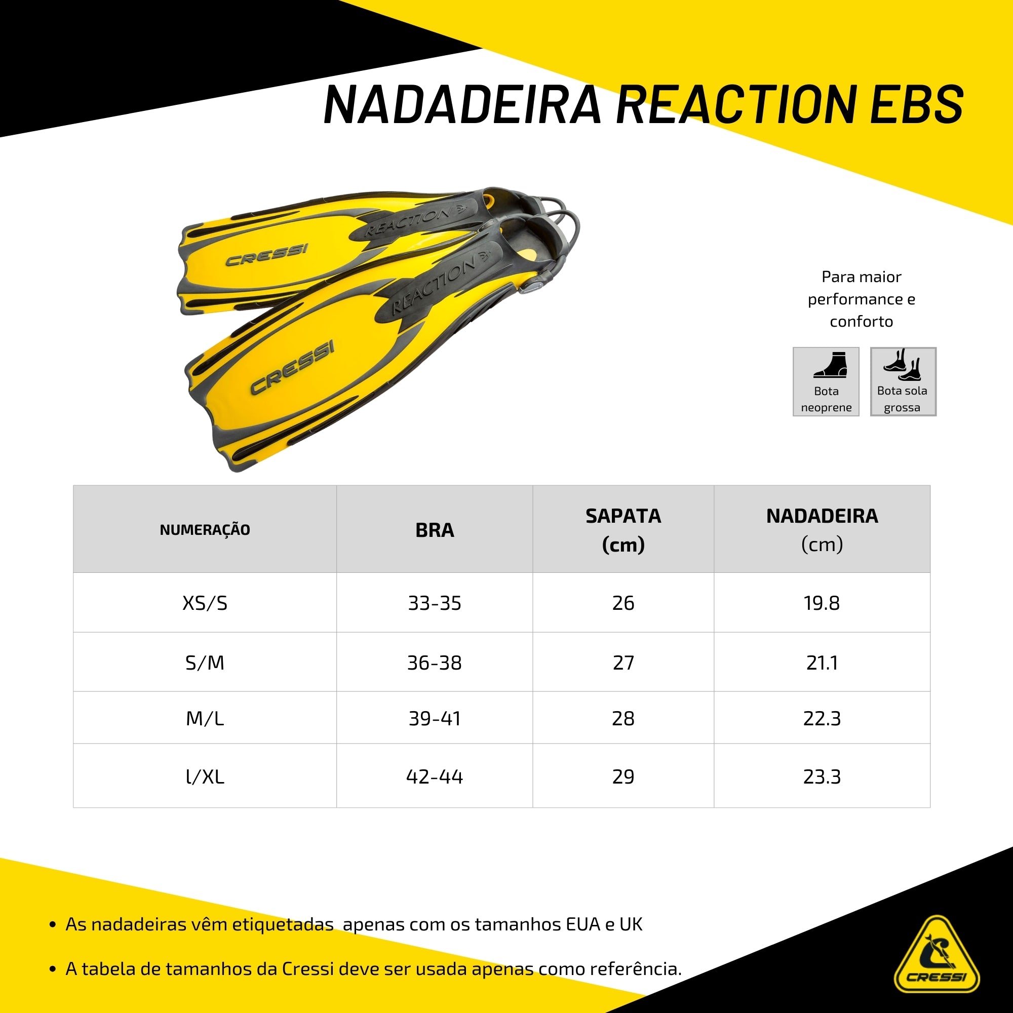 A Nadadeira Cressi Reaction EBS foi desenvolvida para mergulho autônomo, oferecendo máxima eficiência com o mínimo esforço. Ela facilita a movimentação do mergulhador e de seu equipamento, garantindo um consumo de ar mais adequado e menor gasto de energia. Projetada para ser usada com botas de mergulho, proporciona conforto, proteção aos pés e facilidade na colocação.