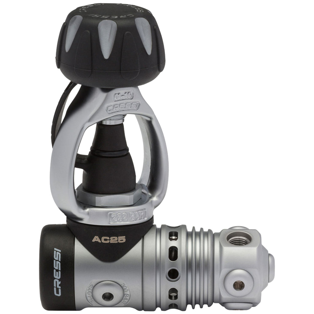 O 1º estágio AC25, leve e compacto, mantém o fluxo de ar constante mesmo com a queda da pressão no cilindro. Sua torre giratória facilita a organização das mangueiras e oferece maior liberdade de movimento ao mergulhador.